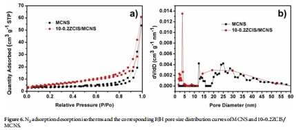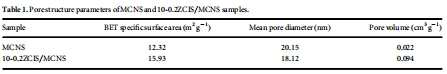 數據:MCNS和10-0.2ZCIS/MCNS的比表面積分別為12.32和15.93 m2 g?1,平均孔徑約20 nm,呈介孔結構。