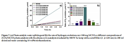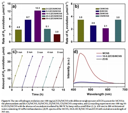 數據:10-0.2ZCIS/MCNS產氫速率最高(12.3 μmol h?1),是純MCNS的110倍;最優組成為10 wt% ZCIS和Cu/In摩爾含量0.2。