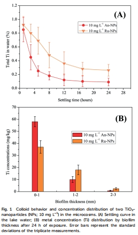 數(shù)據(jù):沉降曲線(Fig. 1A)顯示An-NPs在12小時(shí)內(nèi)快速沉降,而Ru-NPs沉降較慢;Ti分布(Fig. 1B)顯示An-NPs主要沉積在生物膜表面(<1 mm,75.2 mg kg?1),Ru-NPs能滲透更深(56.4 mg kg?1)。