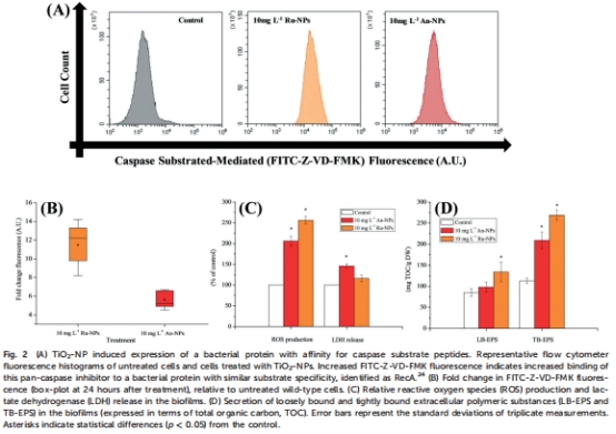 揭示不同晶型TiO2-NPs(An-NPs和Ru-NPs)對(duì)淡水生物膜的毒性機(jī)制差異,包括細(xì)胞死亡模式、ROS產(chǎn)生和抗氧化響應(yīng)。