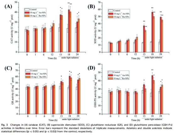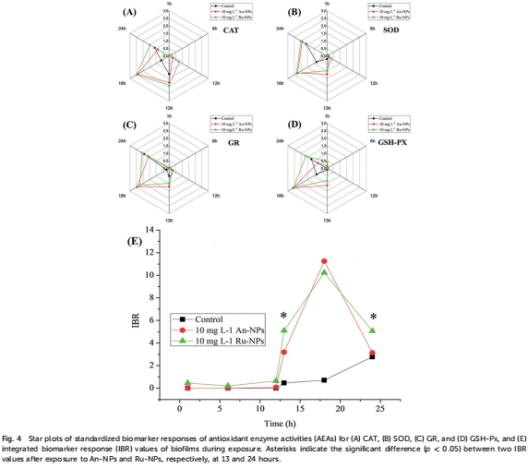 研究意義:IBR綜合了多種酶活性,有效評(píng)估生物膜健康狀態(tài)。An-NPs的急性效應(yīng)與光氧化相關(guān),Ru-NPs的漸進(jìn)毒性與滲透和細(xì)胞內(nèi)ROS相關(guān)。