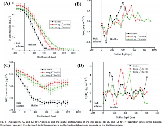研究意義:微電極提供高分辨率代謝數(shù)據(jù),顯示TiO2-NPs普遍抑制氨氧化,但氧抑制僅限于上層。Ru-NPs對(duì)氨氧化的抑制更強(qiáng), due to更深滲透。