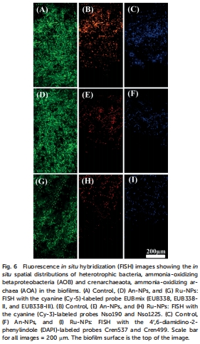 支持機(jī)制驗(yàn)證:微電極數(shù)據(jù)與FISH結(jié)果(Fig. 6)互補(bǔ),顯示代謝抑制與AOMs分布變化相關(guān)。例如,氨氧化抑制與AOB/AOA減少吻合,驗(yàn)證了功能微生物的毒性響應(yīng)。