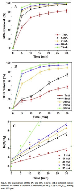 數據:EF在28 mA電流下完全降解MCs(<1 μg L?1),TOC去除率95%;7 mA時MCs降解83%,TOC去除47%。