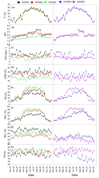 數據:IVCWs平均TN去除率46.8%(IVCW3最高55.1%),TP去除率62.3%(IVCW5最高70.8%);出水TN降至1.19 mg/L,TP降至0.072 mg/L,達IV類標準。Fig. 3顯示水質參數隨時間變化,夏季去除率高(溫度影響)。