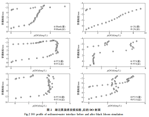 數據:黑臭前,PT10組DO穿透深度最深(13.4 mm);黑臭后,黑臭組界面DO降至0,PT15組仍保持1.7 mm穿透深度。