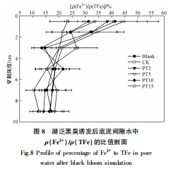 數據:黑臭組表層間隙水Fe2?占比達40%,AVS積累(0.51 μg/g);PT15組Fe2?占比25.2%,AVS僅為0.51 μg/g(黑臭組的14.6%-17.2%)。