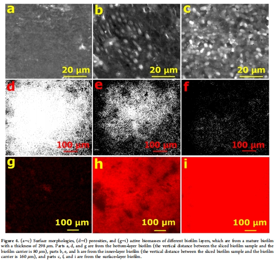 數據:表層孔隙率最高(88.03±4.96%),底層最低(26.17±8.67%);活性生物量從表層到底層遞減。