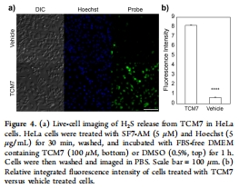 數據:Figure 4a顯示,TCM7處理細胞后,SF7-AM熒光增強(綠色),表明H2S釋放;對照(DMSO)無信號。Figure 4b量化熒光強度,TCM7組顯著高于對照。