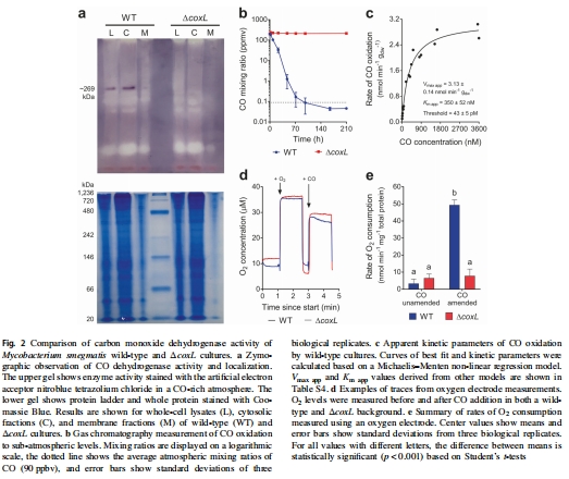 數據:活性染色顯示WT細胞在100% CO下具特異性條帶(~269 kDa),ΔcoxL無;GC測得其將200 ppmv CO降至46±5 ppbv,Km app=350 nM,閾值43 pM;氧電極顯示CO添加使O2消耗速率增加15倍(p<0.0001)。
