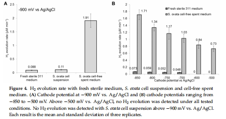 數(shù)據(jù):S. ovata細(xì)胞懸浮液中,-900 mV時(shí)H2演化速率僅0.11±0.02 μM/min,電子回收率8.5±1.5%,但乙酸產(chǎn)量6.6±0.2 μM,庫(kù)倫效率75±3%。