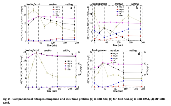 1 N2O排放和氮去除數據:來自圖1和表1,顯示MF-SBR的N2O轉化率比C-SBR降低34.3%,TN和NH4-N去除效率分別提高22.4%和39.5%。研究意義是證實磁場在低溫下能有效抑制N2O排放并提升脫氮性能,為污水處理提供經濟高效的技術選擇,避免昂貴溫控設施。