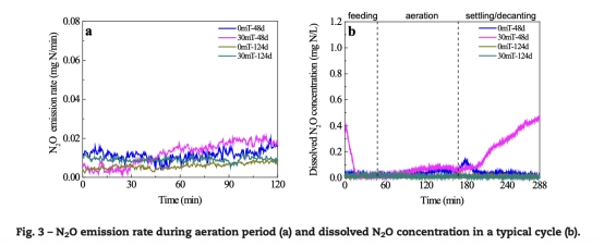 2 運行周期內N2O和氮化合物變化數據:來自圖2和圖3,顯示N2O主要在沉降和排水期通過反硝化產生,好氧期與亞硝酸鹽積累相關。研究意義是揭示N2O產生時段和途徑,磁場通過促進亞硝酸鹽轉化和反硝化酶活性減少N2O積累,優化過程控制。