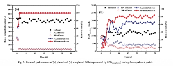 2 酚和非酚COD去除數據:來自圖3,酚在兩種反應器中均快速去除,但非酚COD在RB去除率達80%,高于RA的60%。研究意義是表明載體微環境促進了有毒難降解化合物(如喹啉、吲哚)的水解,改善了廢水可生化性。