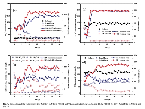 3 氮去除數據:來自圖4,RB的TN去除效率達87%,NH4-N和NO3-N濃度分別降至4mg/L和15mg/L,而RA為19mg/L和52mg/L。研究意義是顯示SDCND在RB中有效實現,歸因于好氧硝化和缺氧反硝化的協同,解決了碳源不足問題。