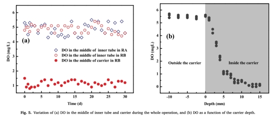 使用丹麥Unisense電極測量數據的研究意義在于其高精度原位監測能力,能夠揭示反應器微環境中的溶解氧分布動態。具體地,微電極測量顯示載體內部形成了明顯的DO濃度梯度(如圖5),從外部好氧區(DO充足)到內部缺氧區(DO接近零),這直接證實了缺氧微環境的形成。這種測量為SDCND機制提供了關鍵證據:氧傳輸受限導致好氧和缺氧區共存,從而支持硝化細菌在好氧區活動,反硝化細菌在缺氧區利用碳源進行反硝化。研究意義在于優化反應器設計,通過微電極數據指導載體配置和操作參數(如曝氣量),以最大化微環境效益,提高廢水處理效率。此外,該方法避免了傳統采樣破壞樣本,實現了實時連續監測,為類似生物處理系統的微尺度研究提供了技術支撐。