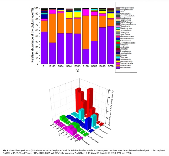 4 微生物群落數據:來自圖5和圖6以及表2,高通量測序顯示Z-MBBR中反硝化細菌(如Thermomonas、Flavobacterium)豐度更高,且微生物多樣性更豐富(如75天時ACE指數為833,高于S-MBBR的566)。研究意義是從微生物角度驗證新型載體促進功能菌群富集,增強系統穩定性和脫氮能力。