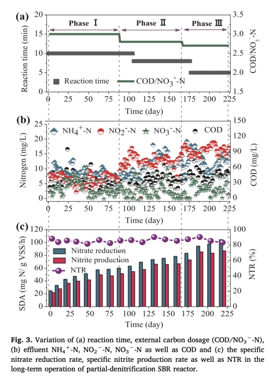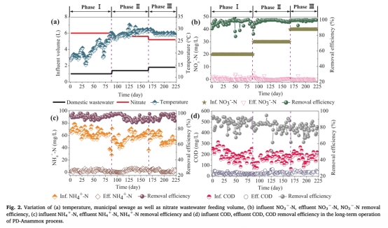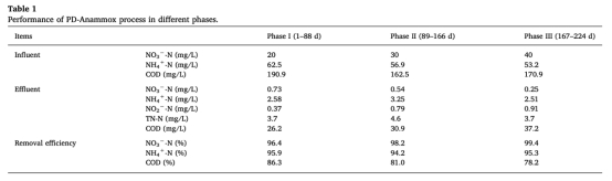 2 部分反硝化性能數(shù)據(jù),如亞硝酸鹽積累率(NTR)、特定硝酸鹽還原速率和特定亞硝酸鹽產(chǎn)生速率,來自Fig. 3。研究意義在于表明PD階段能穩(wěn)定產(chǎn)生亞硝酸鹽(NTR達(dá)85.6%),為Anammox提供底物,確保整個(gè)過程穩(wěn)定性。