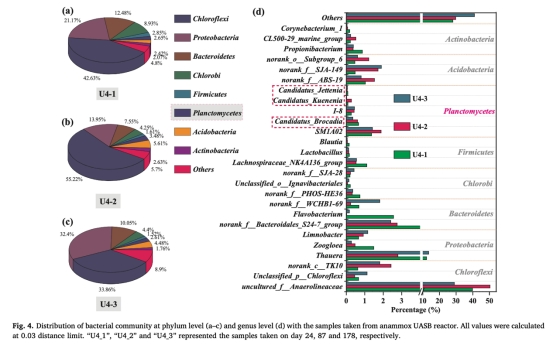 3 微生物群落數(shù)據(jù),如高通量測(cè)序結(jié)果,顯示Planctomycetes、Chloroflexi等菌門比例,來自Fig. 4。研究意義在于揭示Anammox菌(如Candidatus_Brocadia)為主導(dǎo),盡管存在異養(yǎng)菌,但過程仍穩(wěn)定,幫助理解微生物機(jī)制。