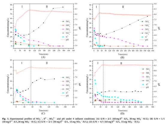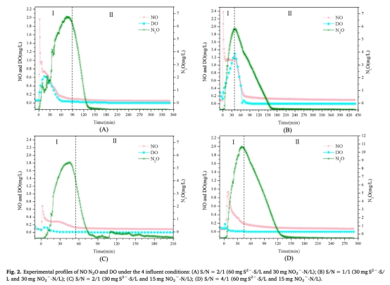 研究采用實(shí)驗(yàn)室規(guī)模的序批式生物膜反應(yīng)器,進(jìn)行一系列批式試驗(yàn),設(shè)置四種不同進(jìn)水條件(變化硫化物和亞硝酸鹽濃度)。通過脈沖投加方式引入底物,在線監(jiān)測(cè)NO、N2O、DO、pH等參數(shù),并分析硫化物、硫酸鹽濃度變化。同時(shí),使用高通量測(cè)序分析微生物群落結(jié)構(gòu),以全面理解SOAD過程中的生物地球化學(xué)行為。