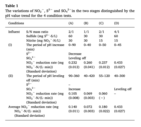 2 pH、硫化物、硫酸鹽濃度數(shù)據(jù),來自Fig. 1和Table 1。研究意義在于區(qū)分硫化物氧化的兩個(gè)階段(先氧化為S0再氧化為SO4^2-),pH變化作為階段劃分指標(biāo),幫助理解反應(yīng)進(jìn)程和效率。