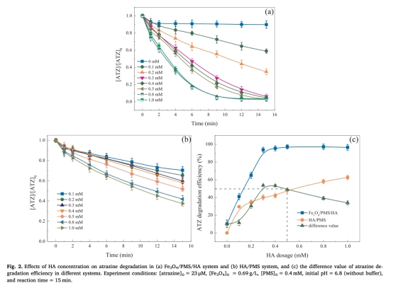 1 阿特拉津降解效率數(shù)據(jù),來(lái)自Fig.1a和Fig.2。研究意義:Fe3O4/PMS/HA系統(tǒng)降解率94%,遠(yuǎn)高于其他系統(tǒng),證明HA通過(guò)雙重角色(活化PMS和促進(jìn)Fe循環(huán))顯著增強(qiáng)降解;HA濃度優(yōu)化為0.3-0.5 mM,過(guò)高時(shí)HA主要作為活化劑而非還原劑。