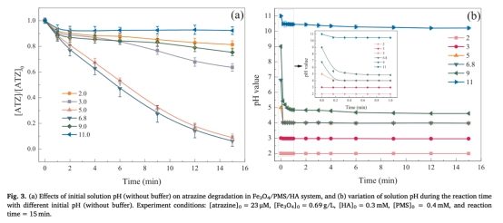 3 pH影響數(shù)據(jù),來(lái)自Fig.3a。研究意義:近中性pH(5.0-6.8)降解效率最高,強(qiáng)酸或強(qiáng)堿抑制降解,因H?影響PMS活化或OH?引起靜電排斥,優(yōu)化pH范圍對(duì)實(shí)際應(yīng)用重要。