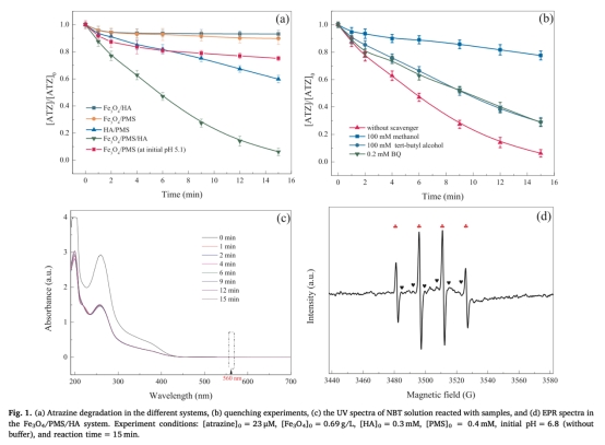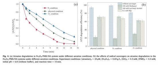 研究通過(guò)比較不同系統(tǒng)(如Fe3O4/PMS、HA/PMS、Fe3O4/PMS/HA)的阿特拉津降解效率,確定最佳操作參數(shù)(如Fe3O4劑量、PMS濃度、HA濃度、pH、通氣條件)。使用淬滅實(shí)驗(yàn)和電子順磁共振(EPR)鑒定自由基物種,XPS分析表面鐵循環(huán),液相色譜-質(zhì)譜(LC-MS)鑒定降解中間體,并利用丹麥Unisense微電極測(cè)量N?O等氣體產(chǎn)物,以闡明HA促進(jìn)降解的機(jī)制。