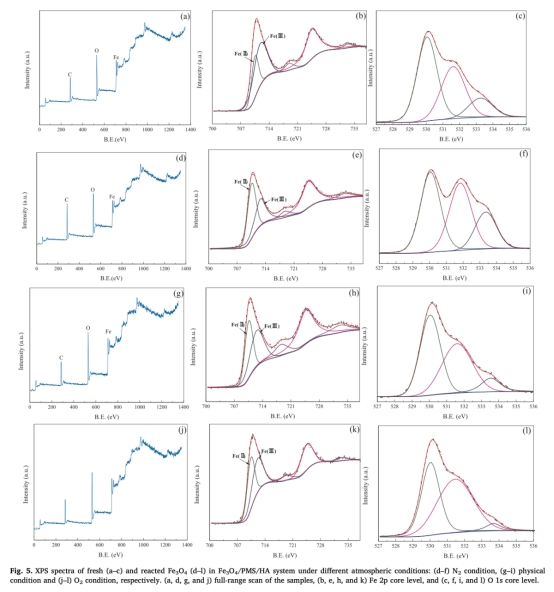 5 表面Fe循環(huán)數(shù)據(jù),來(lái)自Fig.5。研究意義:XPS顯示Fe3O4/PMS/HA-N?系統(tǒng)表面Fe(II)/Fetotal比從0.3328升至0.5356,證明HA促進(jìn)Fe(III)還原為Fe(II),厭氧條件增強(qiáng)此循環(huán)。