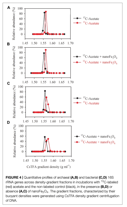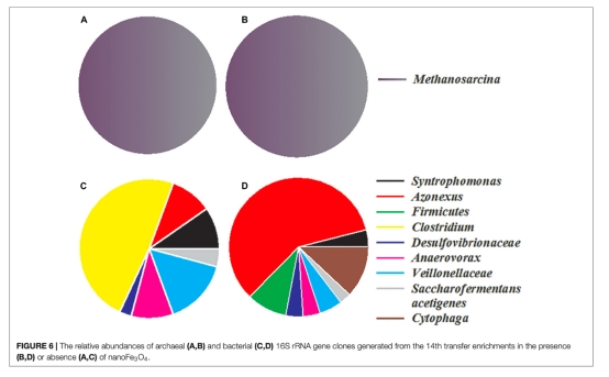 3 微生物群落分析數據:來自Figure 4、Figure 5和Figure 6。通過DNA-SIP和T-RFLP分析,顯示甲烷八疊球菌(Methanosarcina)是主要的產甲烷菌,且納米Fe3O4處理下Azonexus等細菌相對豐度變化。研究意義在于表明納米Fe3O4促進了特定功能微生物的富集,可能與電子傳遞相關。