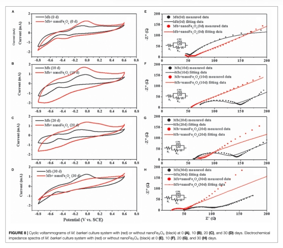 4 電化學分析數據:來自Figure 8。循環伏安法(CV)顯示添加納米Fe3O4后系統電容增加,電化學阻抗譜(EIS)顯示電子傳遞電阻降低。研究意義在于表明納米Fe3O4增強了系統的氧化還原活性和電子傳遞效率,支持其作為電子穿梭體的角色。