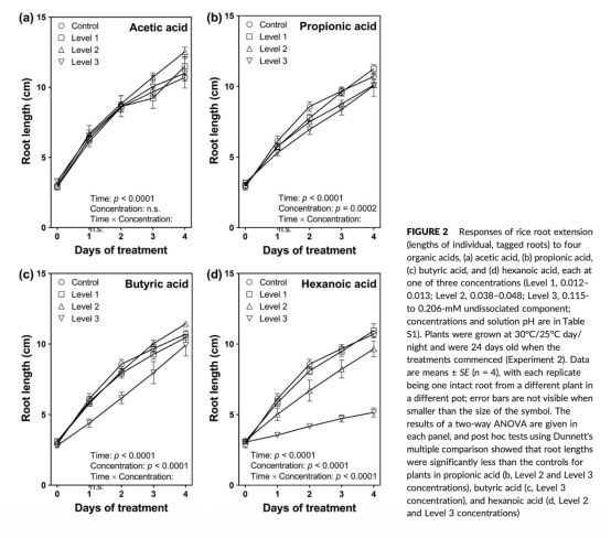 2. 根系伸長速率:有機酸處理4天后,乙酸對伸長無影響,丙酸(Level 2和3)、丁酸(Level 3)和己酸(Level 2和3)顯著抑制伸長。研究意義在于評估有機酸對生長的亞毒性影響,確保ROL屏障誘導非毒性副作用所致。數據來自Figure 2。