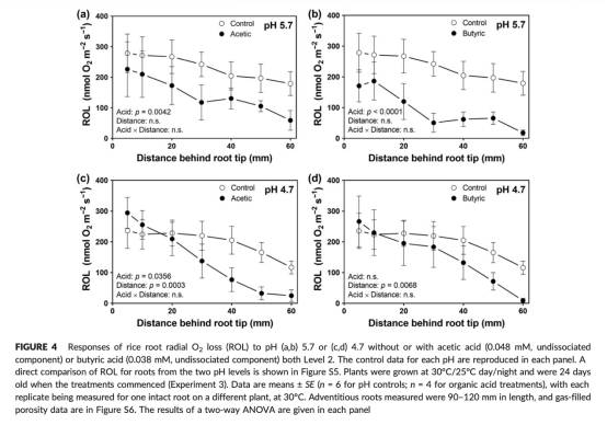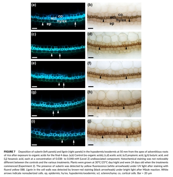 摘要指出,水淹土壤中含有厭氧微生物產生的單羧酸(有機酸),這些酸可積累到植物毒性水平,并促進濕地物種根系徑向氧損失(ROL)屏障的發展。本研究測試了低濃度有機酸(乙酸、丙酸、丁酸、己酸)可能誘導水稻根系ROL屏障形成的假設。結果發現,每種有機酸單獨均能觸發ROL屏障,但對根系伸長影響很小或沒有影響。一些與木栓質生物合成相關的基因轉錄本增加。根系呼吸沒有或僅中度抑制,但超過一定濃度后呼吸呈指數下降。EC50(抑制50%呼吸的有效濃度)順序為丁酸、丙酸、乙酸、己酸。研究揭示了有機酸作為環境信號觸發根系適應性反應的機制,有助于理解植物淹水耐受的分子調控。