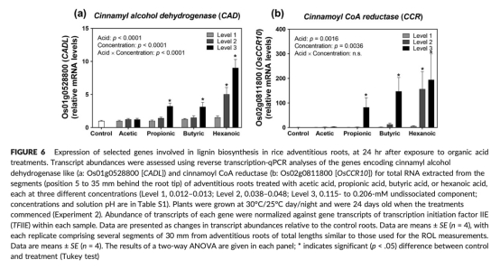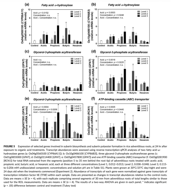 4. 基因轉錄本豐度:有機酸處理24小時后,木栓質相關基因(如CYP86A11、CYP86B3、GPAT、RCN1)轉錄本在丙酸和丁酸處理中增加,木質素相關基因(CADL、OsCCR10)在己酸處理中增加。研究意義在于揭示ROL屏障形成的分子基礎,顯示有機酸特異性調控基因表達。數據來自Figure 5和Figure 6。