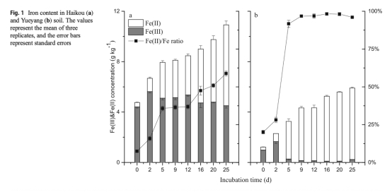 1. Fe(II)和Fe(III)含量變化:來自Fig. 1,數(shù)據(jù)顯示岳陽土壤鐵還原更徹底,F(xiàn)e(II)比例高,研究意義在于表明鐵還原程度與土壤類型相關(guān),影響有機(jī)碳分解速率。