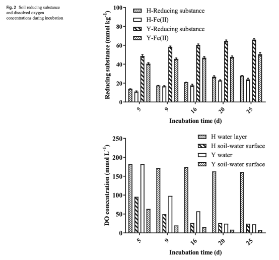 2. 溶解氧(DO)濃度:來自Fig. 2,使用Unisense電極測量,數(shù)據(jù)顯示岳陽土壤DO較低,研究意義在于DO反映氧化還原狀態(tài),低DO促進(jìn)厭氧條件,增強(qiáng)鐵還原和微生物活動。