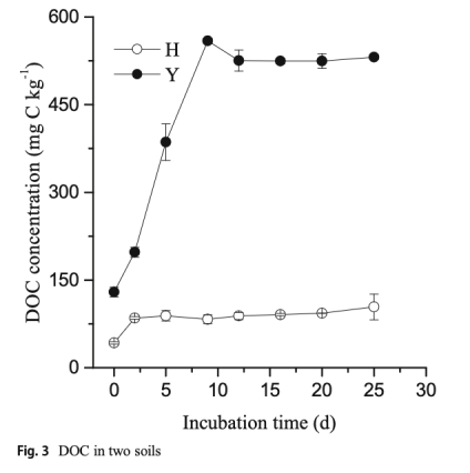 3. DOC濃度變化:來自Fig. 3,數(shù)據(jù)顯示岳陽土壤DOC增加更顯著,研究意義在于DOC增加表明有機(jī)碳溶解,與鐵還原過程耦合,促進(jìn)碳分解。