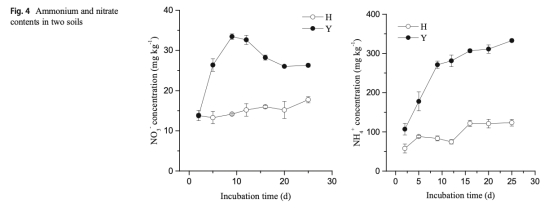 4. 銨和硝酸鹽濃度:來自Fig. 4,數(shù)據(jù)顯示氮礦化與碳分解同步,研究意義在于氮轉(zhuǎn)化反映有機(jī)質(zhì)礦化,受鐵還原影響。