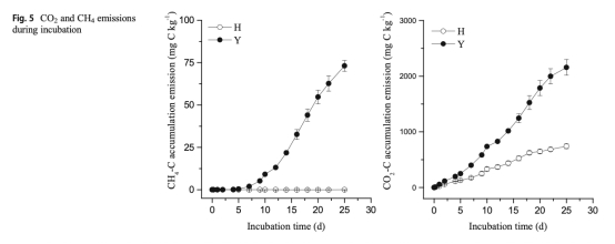 5. CH4和CO2排放:來自Fig. 5,數(shù)據(jù)顯示岳陽土壤氣體排放更高,研究意義在于直接量化有機(jī)碳分解為溫室氣體,鐵還原刺激分解過程。