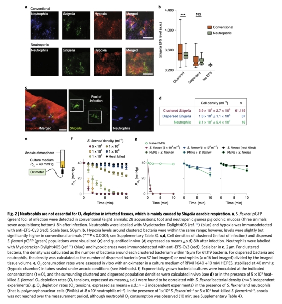 3. 氧氣消耗速率:使用丹麥Unisense氧化電極,在體外模擬生理氧分壓(40 mmHg)下,測量不同密度的福氏志賀氏菌及其突變株、其他病原菌以及細菌與中性粒細胞共培養時的氧氣消耗動力學。意義在于定量地證明了高密度細菌(模擬體內聚集灶密度)能迅速耗盡氧氣,且其耗氧能力遠超中性粒細胞,從而確定細菌有氧呼吸是體內缺氧形成的主要驅動力。數據來自圖2e, f, g,圖3b,4e。