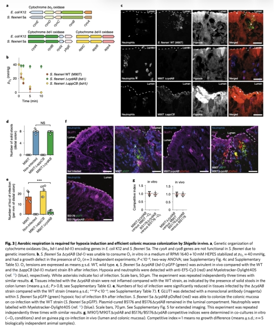 6. 競爭指數和宿主反應標志物:通過共感染實驗比較野生株與突變株在體內外的生存優勢,并檢測缺氧誘導因子GLUT1的表達。意義在于證實了在野生株創造的低氧環境下,呼吸缺陷株也能定植,進一步支持了細菌介導的缺氧對定植至關重要;同時GLUT1的上調是組織缺氧的間接證據。數據來自圖3f, g。