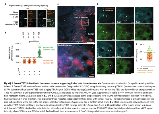 5. 三型分泌系統活性:使用T3SS活性報告質粒(pTSAR),在體內感染灶中于單細菌水平檢測T3SS的活性。意義在于發現感染灶內大多數細菌的T3SS處于失活狀態,這解釋了缺氧環境如何抑制細菌的擴散能力,從而促進其以聚集灶形式定植和擴展。數據來自圖4a, b, c, d, e。