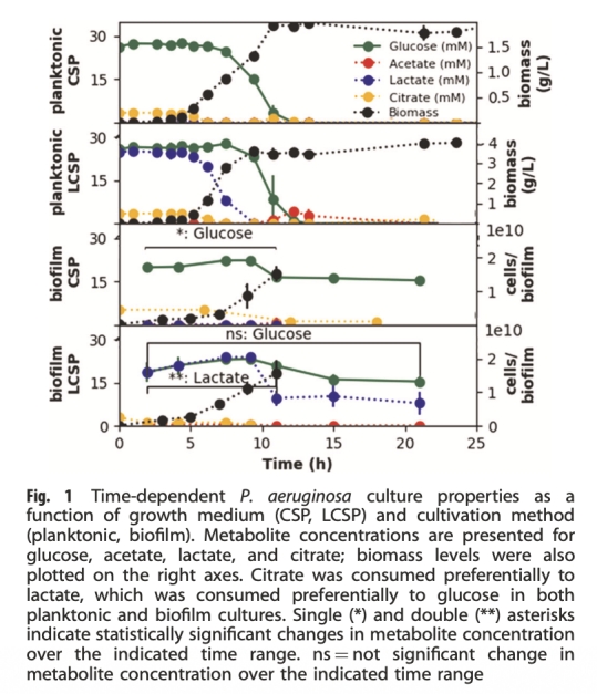 1. 代謝物濃度數據:測量了葡萄糖、乳酸、乙酸和檸檬酸等碳源的濃度變化,來自圖1和圖2。研究意義是直接顯示碳源消耗順序,證實反向雙峰表型,即乳酸優先于葡萄糖被利用,這有助于理解生物膜代謝策略與浮游狀態的差異。