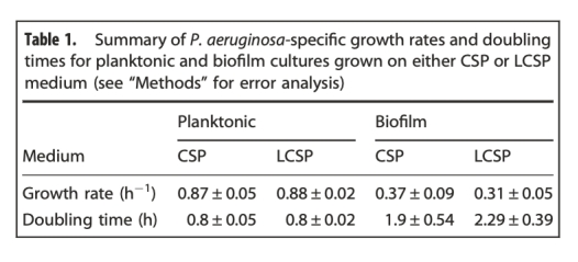2. 生物量數據:測量了培養物的生長速率和倍增時間,來自表1。研究意義是顯示生物膜生長較慢,可能與營養擴散限制相關,這突出了生物膜環境的獨特性,影響代謝通量計算。