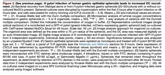 1 樹突狀細(xì)胞招募數(shù)量:通過(guò)共聚焦顯微鏡量化與胃球體上皮接觸的樹突狀細(xì)胞數(shù)量,顯示幽門螺桿菌感染后招募增加(圖1C、圖3E)。研究意義在于證實(shí)胃上皮在感染時(shí)主動(dòng)增強(qiáng)免疫細(xì)胞招募,為黏膜免疫應(yīng)答提供直接證據(jù),數(shù)據(jù)來(lái)自圖1和圖3。