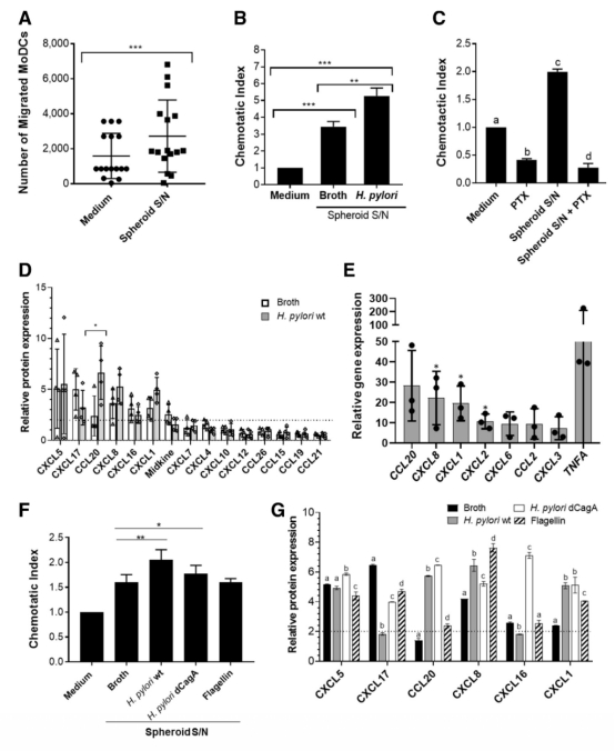 2 趨化因子表達(dá)水平:使用蛋白質(zhì)陣列和PCR陣列測(cè)量胃球體上清液中的趨化因子濃度,如CXCL1、CCL20等,感染后顯著上調(diào)(圖4D、4E)。研究意義在于識(shí)別關(guān)鍵趨化因子驅(qū)動(dòng)樹突狀細(xì)胞遷移,揭示分子機(jī)制,數(shù)據(jù)來(lái)自圖4。