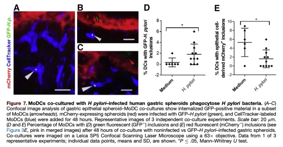 4 樹突狀細(xì)胞吞噬功能:通過(guò)共聚焦顯微鏡觀察樹突狀細(xì)胞對(duì)GFP標(biāo)記的幽門螺桿菌的攝取,顯示感染后吞噬活動(dòng)增強(qiáng)(圖7A-D)。研究意義在于證明樹突狀細(xì)胞在共培養(yǎng)模型中具有功能性抗原呈遞能力,數(shù)據(jù)來(lái)自圖7。