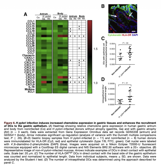 5 組織樣本驗(yàn)證:人類胃活檢樣本的免疫組化分析顯示,幽門螺桿菌感染患者上皮附近樹突狀細(xì)胞數(shù)量增加(圖6C、6D)。研究意義在于將體外模型結(jié)果轉(zhuǎn)化為臨床相關(guān)性,強(qiáng)化發(fā)現(xiàn)的可信度,數(shù)據(jù)來(lái)自圖6。