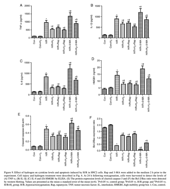 7 自噬調節對細胞因子和凋亡的影響數據來自圖9。研究意義是驗證自噬的作用,使用rapamycin和3-MA顯示氫通過自噬抑制炎癥和凋亡。