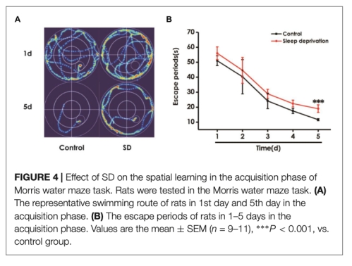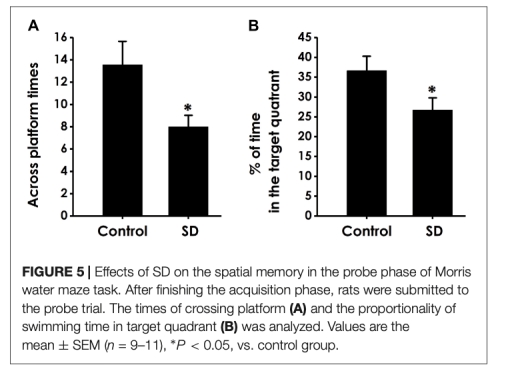 4 莫里斯水迷宮測試數據來自圖4和圖5,顯示SD組逃避潛伏期增加、目標象限時間減少和平臺穿越次數減少。研究意義是驗證SD損害空間學習和記憶。